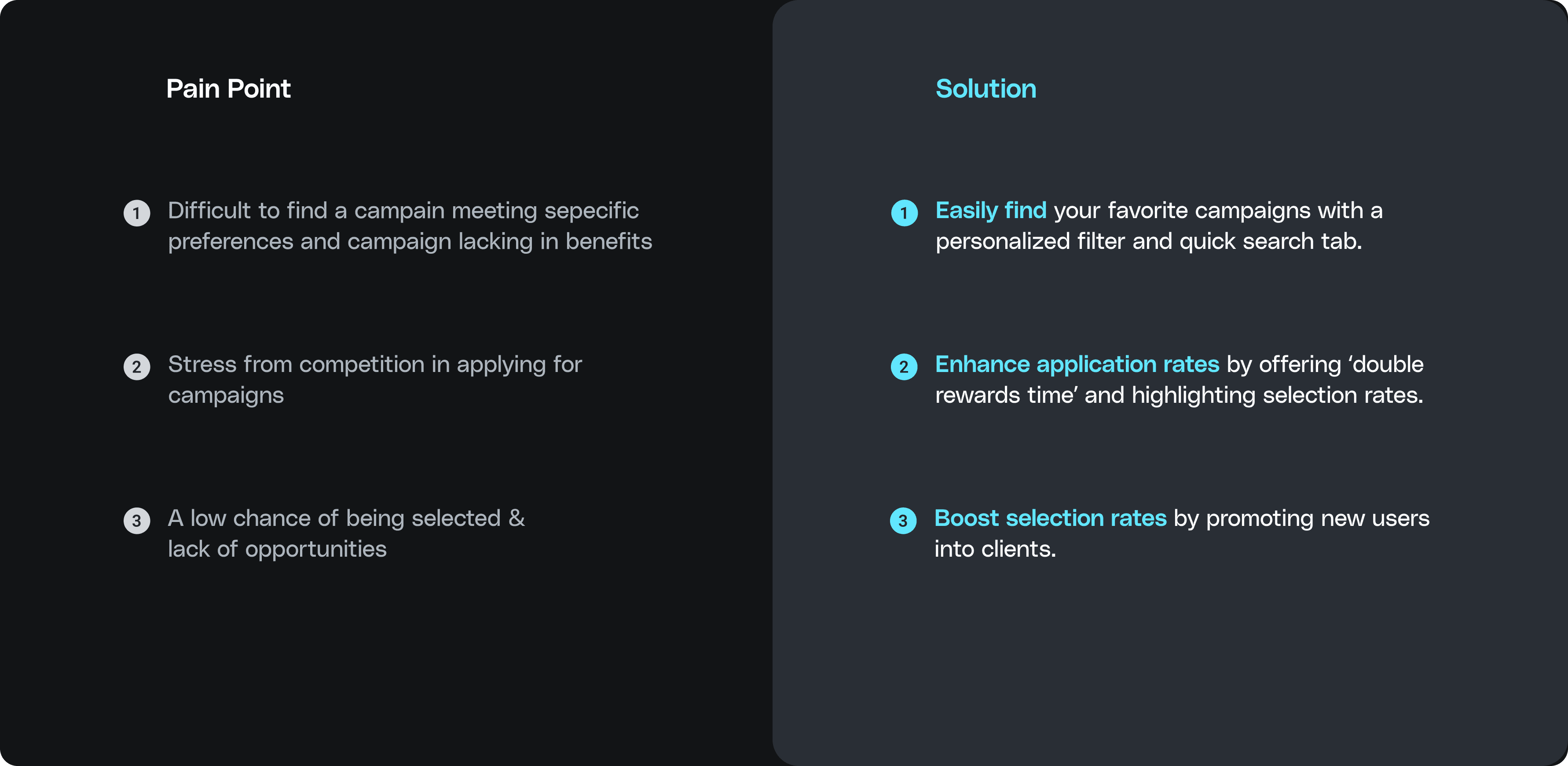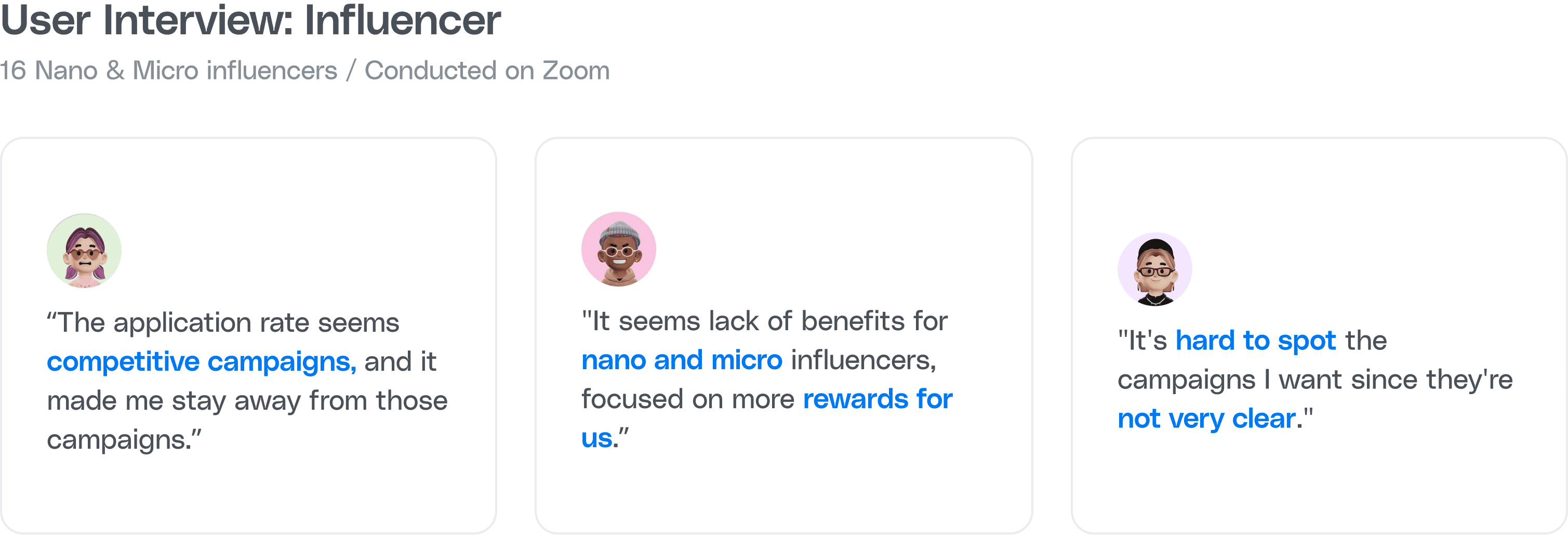 The AS-IS analysis reveals several breakdowns in the platform’s campaign cycle. Users experience low visibility of filters, inconsistent navigation patterns, and unclear application steps, resulting in the lowest click-through rates within the Apply stage. Additionally, advertisers face difficulty selecting suitable influencers due to inconsistent data presentation. These gaps highlight the need for a more intuitive, guided flow that connects exploration, filtering, and application with fewer disruptions.