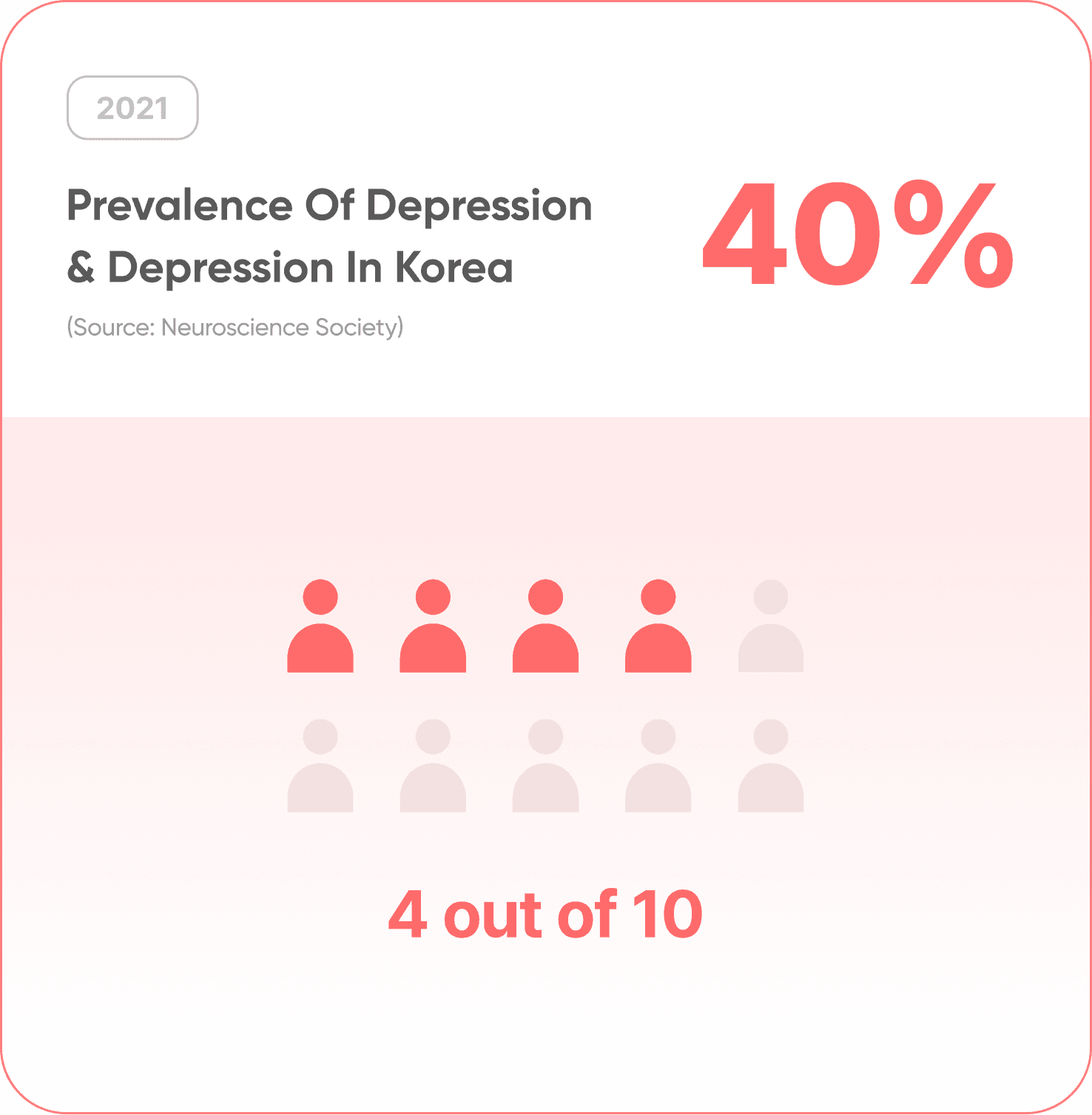 Depression is a major issue in Korean society, affecting nearly half the population, with women experiencing it twice as often as men. Desk research revealed that 78% of married women struggle with loneliness and social isolation, highlighting the urgency of addressing female mental health.